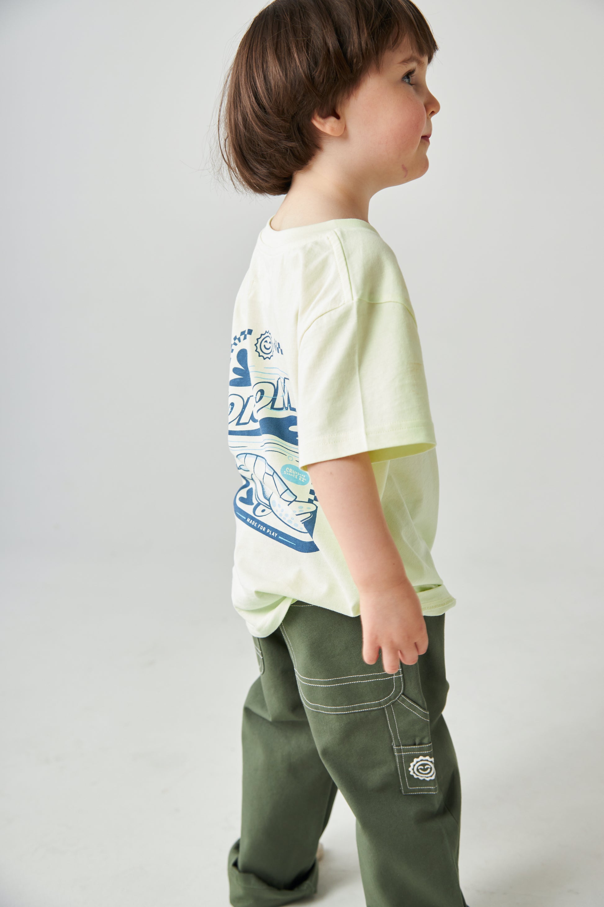 Model is age 3.5 and wearing size 4-5 for an oversized fit. Size 2-3 would be a true fit.